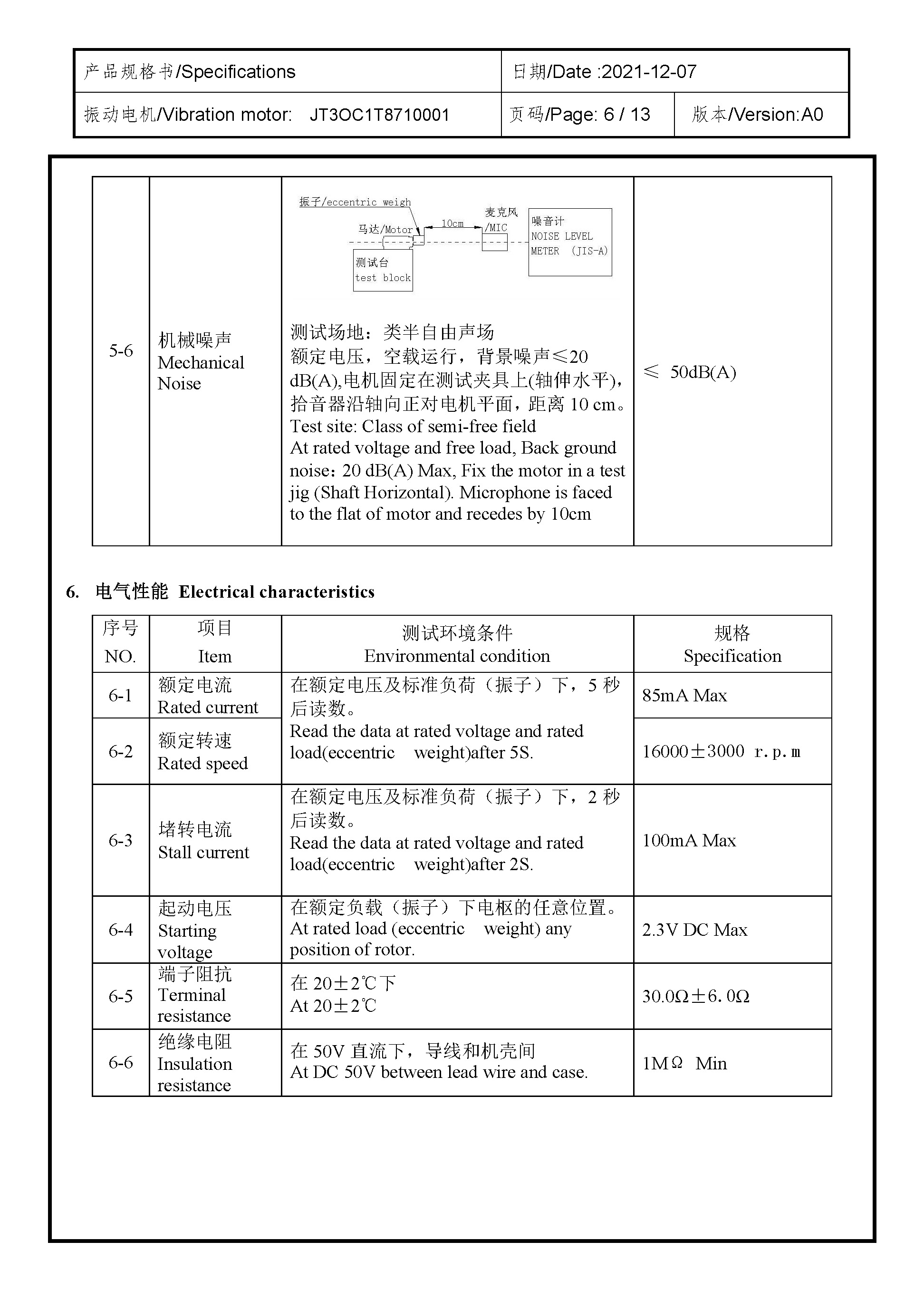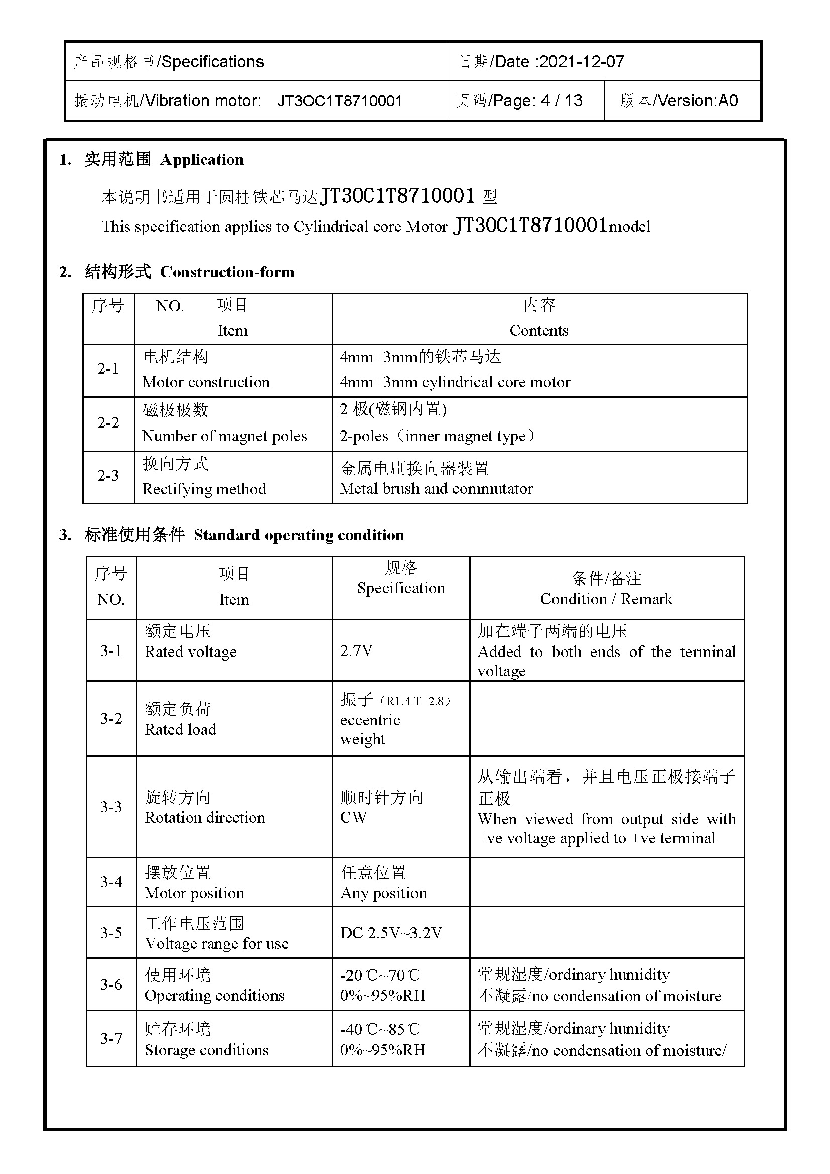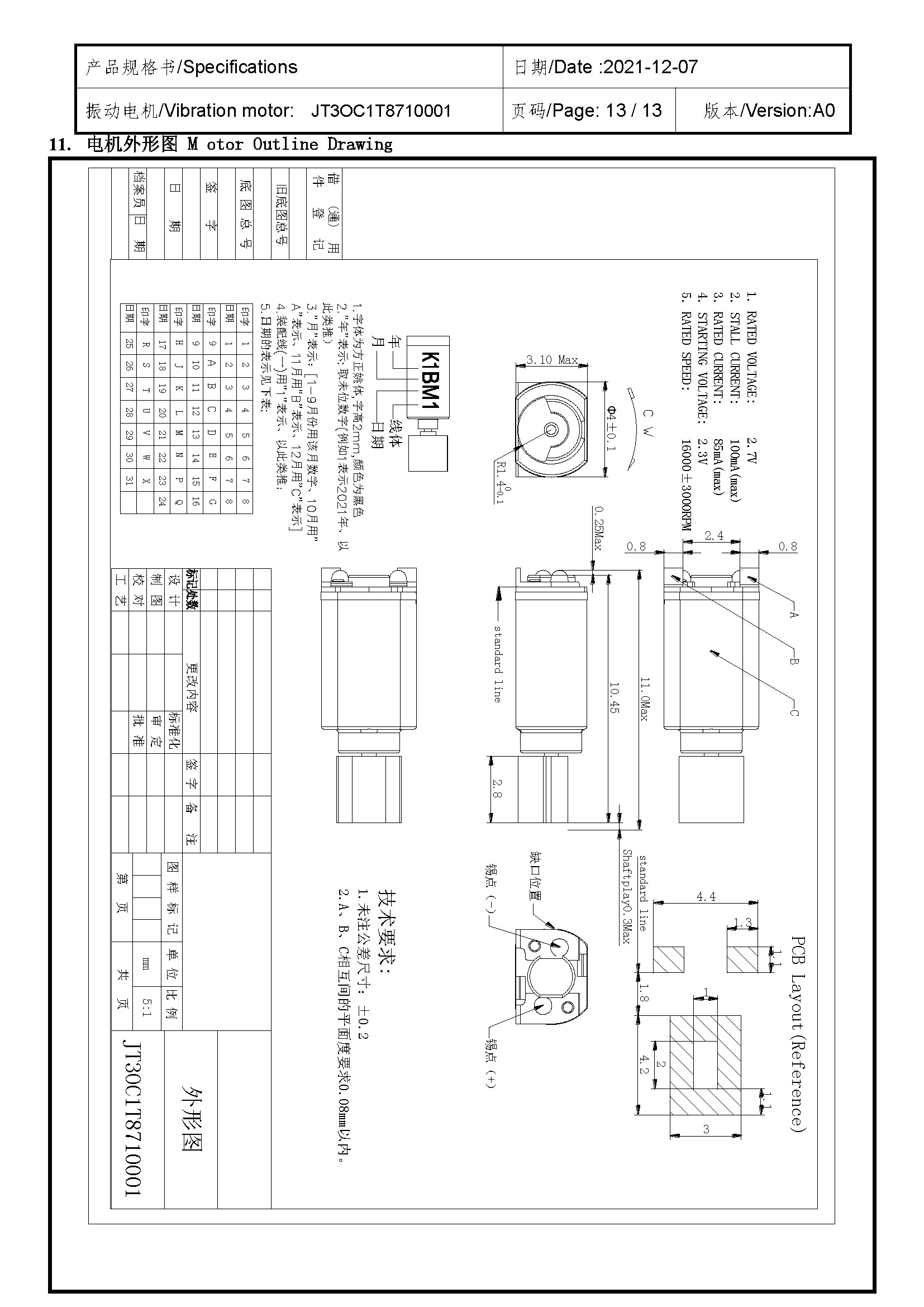 Size:11.0×4.0×3.1 | Rated voltage:2.7V | Rated current:≤85MA | Rated speed:16000±3000 | Starting voltage:≤2.3V