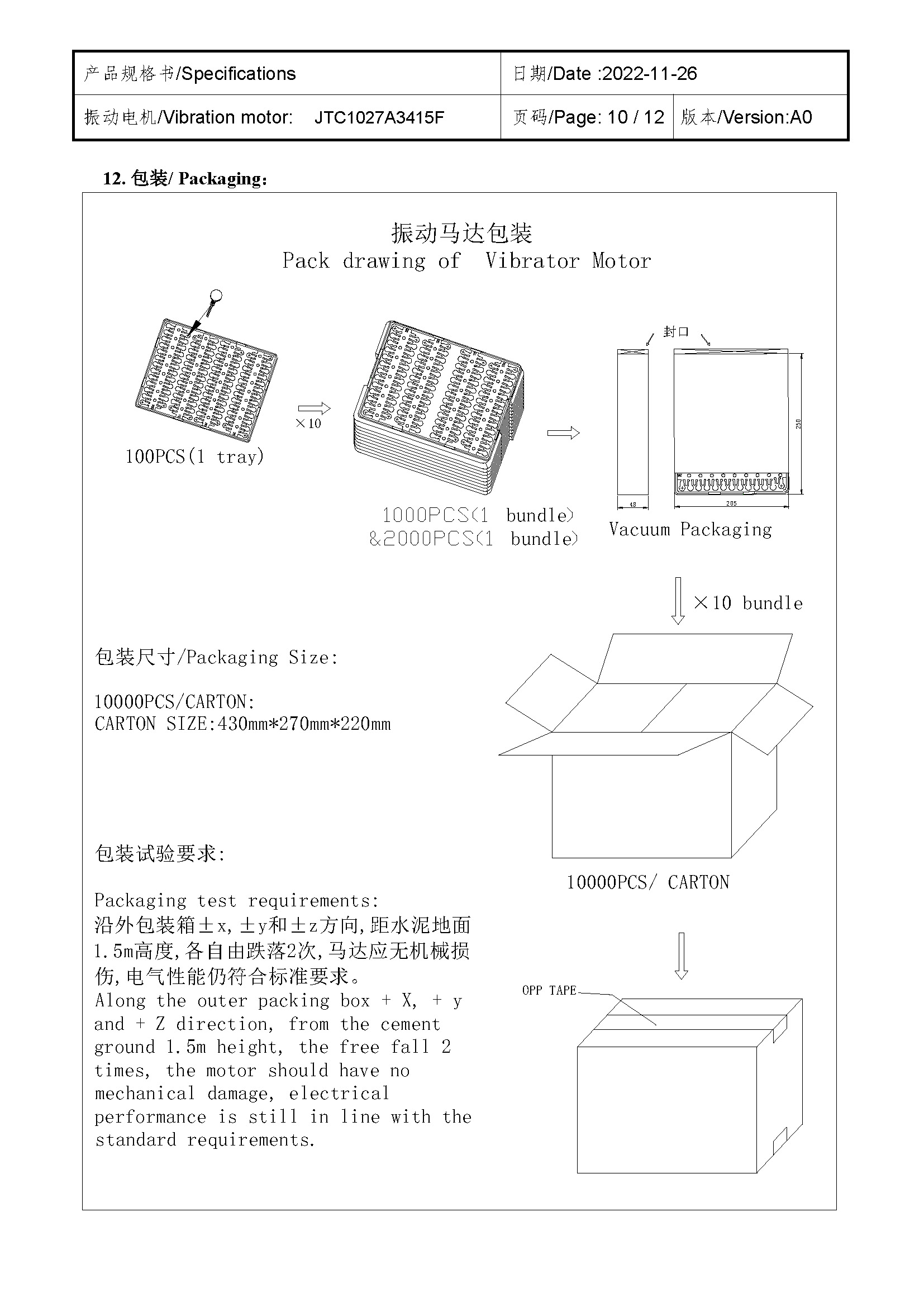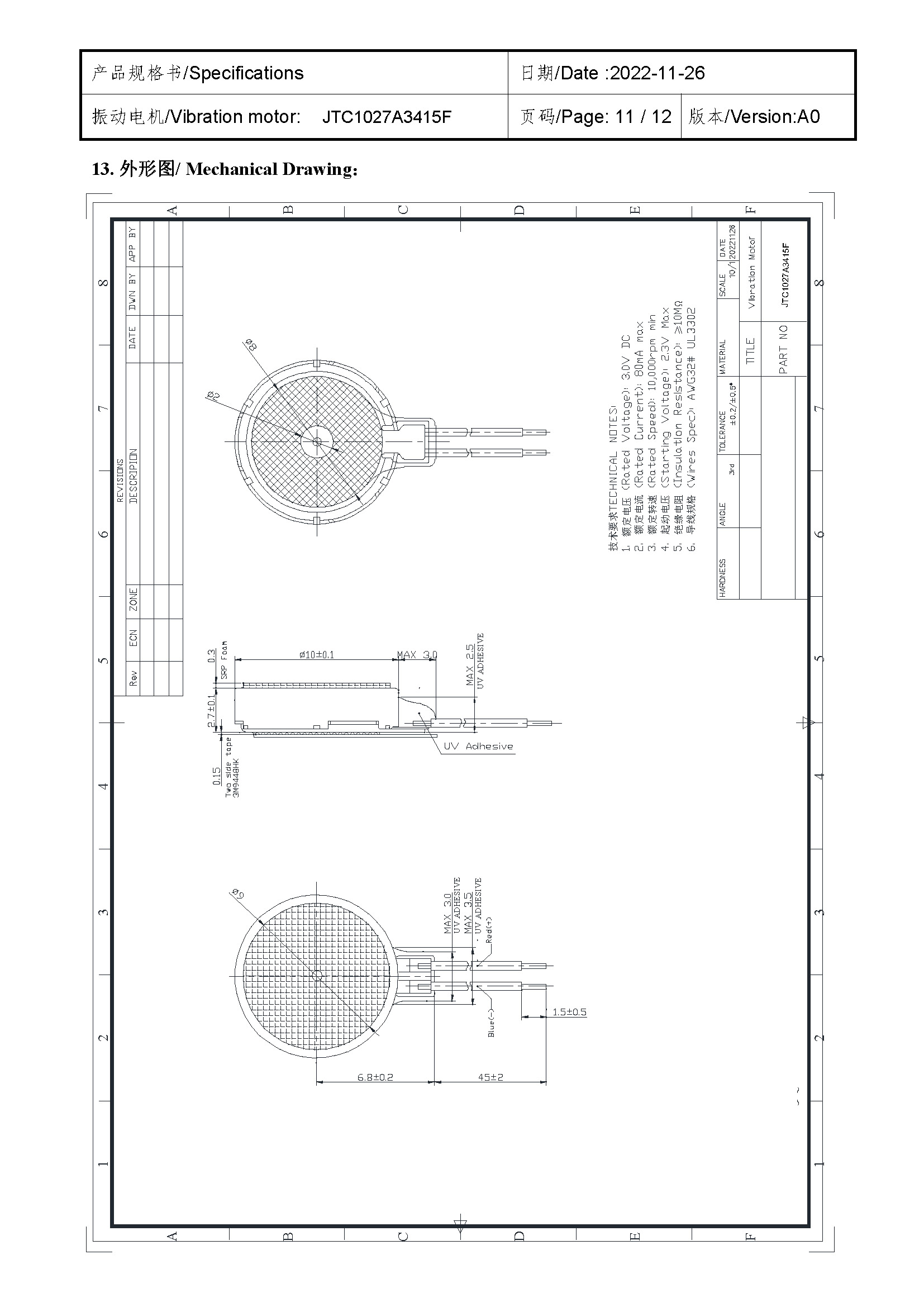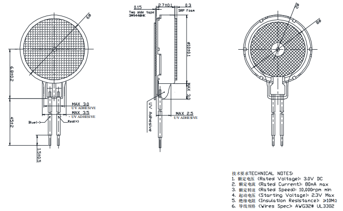 Size:Φ 10*2.7 | Rated voltage:3.0V | Rated current:≤80mA | Rated speed:10000 | Starting voltage:≤2.3V