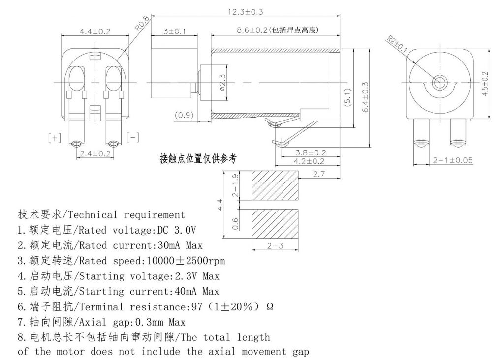 Size:16.6*4.4*4.5 | Rated voltage:3.0V | Rated current:30mA | Rated speed:10000±2500 | Starting voltage:≤2.3V