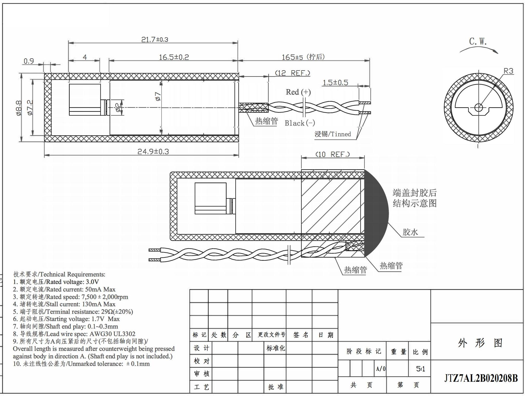 Size:16.6*5.2*5.0 | Rated voltage:3.0V | Rated current:≤180mA | Rated speed:12000±2500 | Starting voltage:≤1.7V