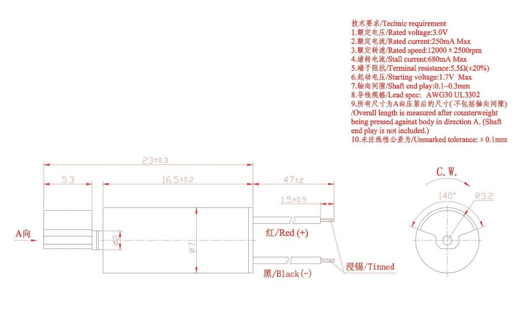 Size:23.3*16.5*7.0 | Rated voltage:3.0V | Rated current:≤180mA | Rated speed:12000±2500 | Starting voltage:≤1.7V