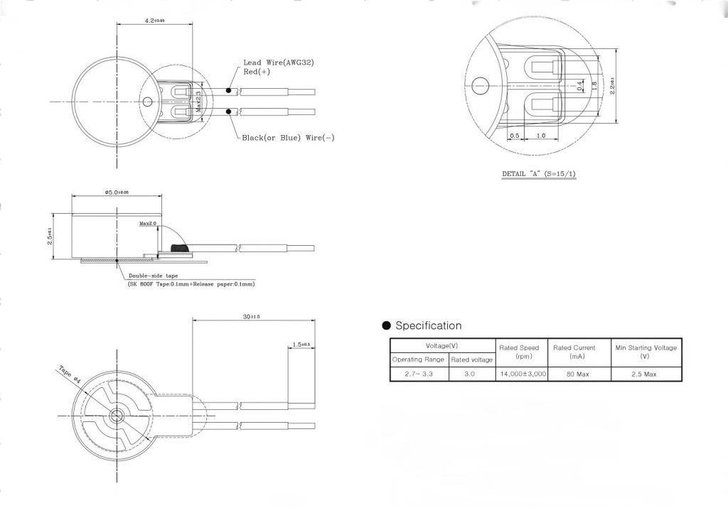 Size:Φ5*2.5 | Rated voltage:3 V | Rated current:≤80mA | Rated speed:14000±3000 | Starting voltage:≤2.5V