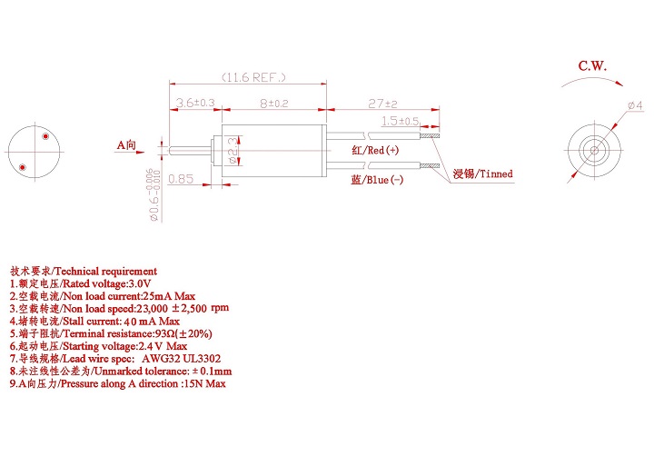 Size:4 mm | Rated voltage:3.0 V | Rated current:DC 直流 | Rated speed:23000±2500rpm | Starting voltage:2.4V DC Max