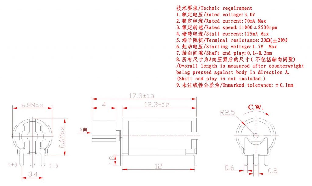 Size:17.3*6.6*6.8 | Rated voltage:3.0V | Rated current:≤70mA | Rated speed:11000±2500 | Starting voltage:≤1.7V