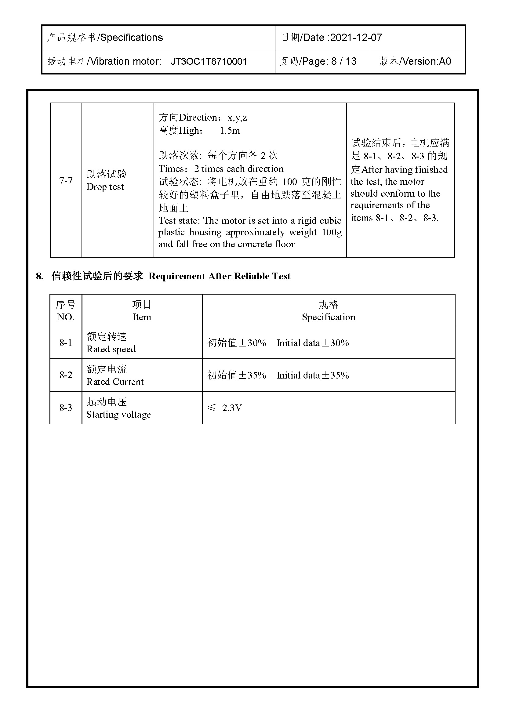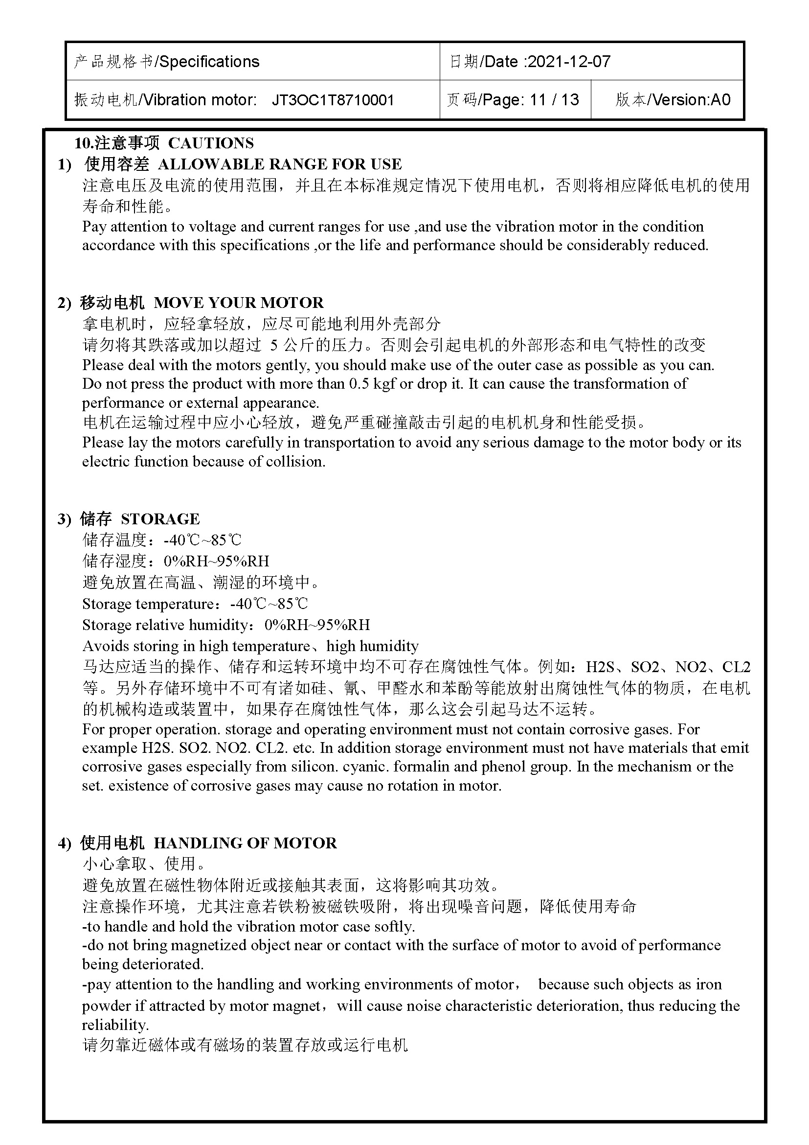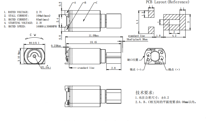 Size:11.0×4.0×3.1 | Rated voltage:2.7V | Rated current:≤85MA | Rated speed:16000±3000 | Starting voltage:≤2.3V